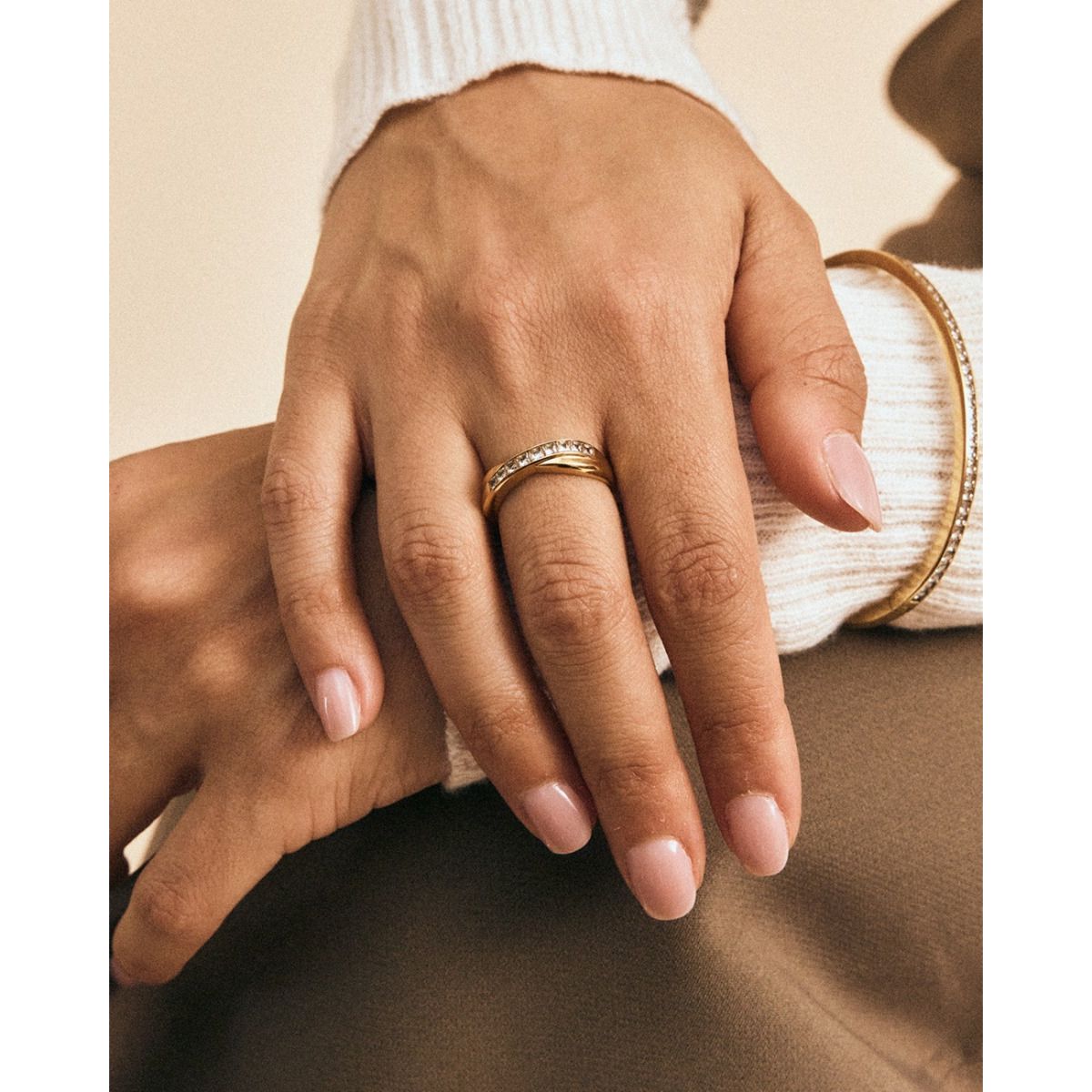 Der Edblad Andorra Duo Gold Ring 126049 ist eine elegante und zeitlose Neuinterpretation der klassischen Andorra-Serie mit weicherer Linienführung. Zwei abgerundete Ringe – einer mit klaren Steinen besetzt, der andere glatt – liegen übereinander und bilden ein harmonisches, stilvolles Design. Die glänzende 14-Karat-Goldbeschichtung verleiht dem Ring einen warmen, luxuriösen Glanz.
