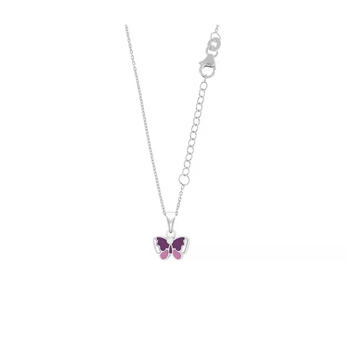 Silberne Halskette mit violettem Schmetterling.