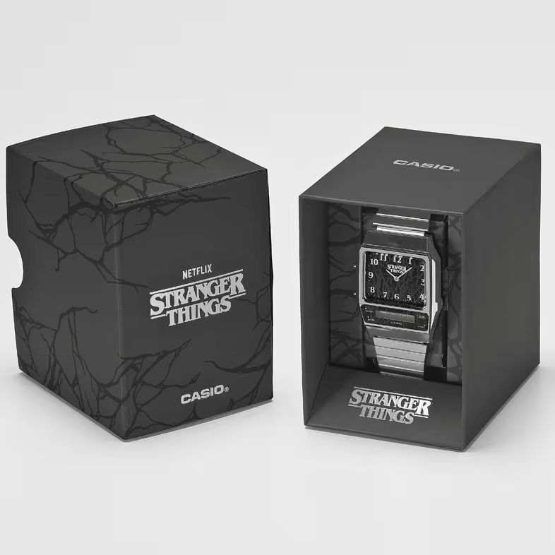 The Casio Vintage Stranger Things Limited Edition AQ-800EST-1AER is a special collaboration celebrating the final chapter of Stranger Things. Based on the classic AQ-800, the watch blends elements from the show’s two parallel realms — the familiar world and the ominous Upside Down. The dial features twisting vine motifs inspired by Vecna’s creeping presence, while the raised metallic indexes use the distinctive Stranger Things typeface. The case back is engraved with the series logo, and the clasp cover displays “001,” referencing Vecna’s tattoo. Special packaging featuring Demogorgon and vine graphics completes the collectible presentation. A fitting tribute to the iconic series as it reaches its conclusion.