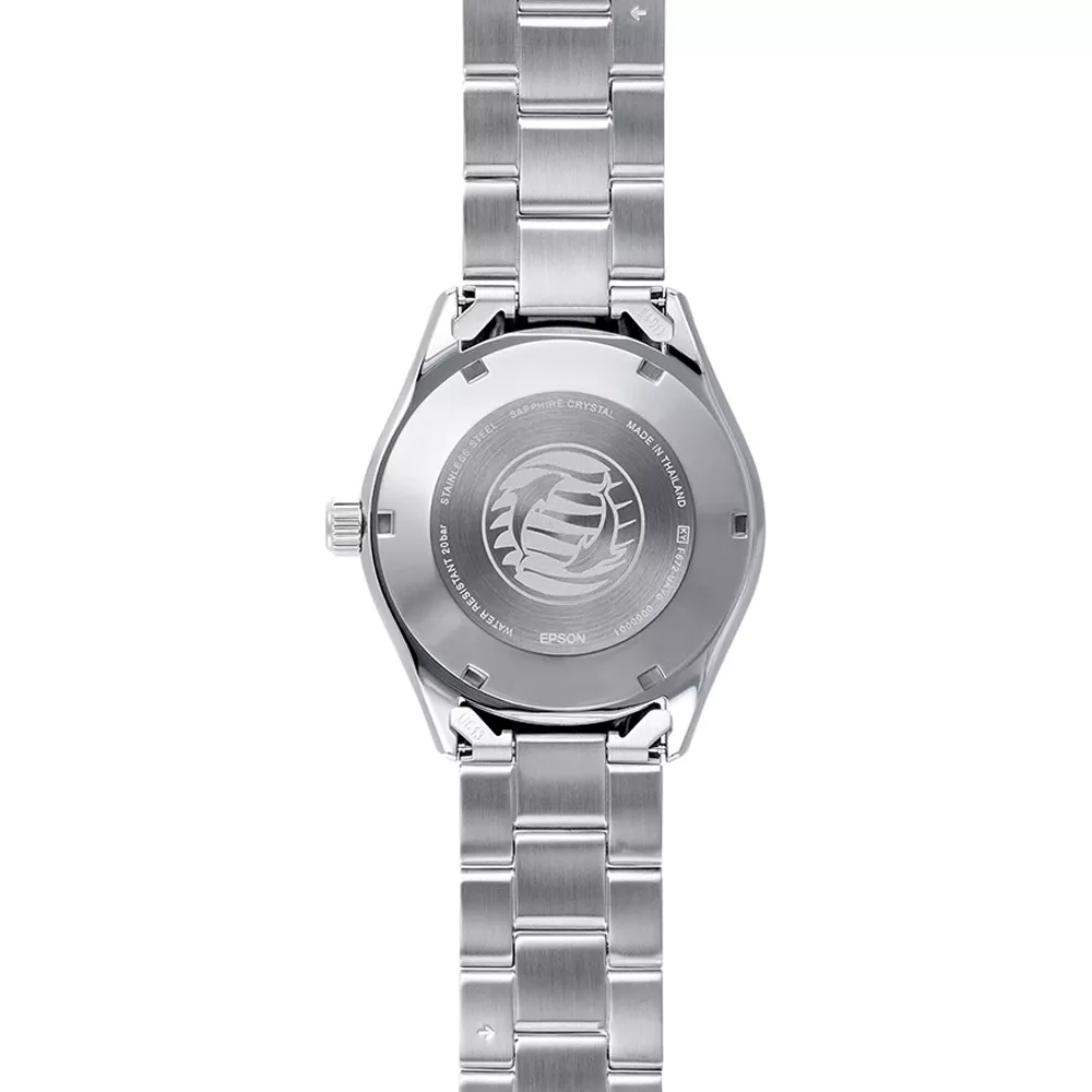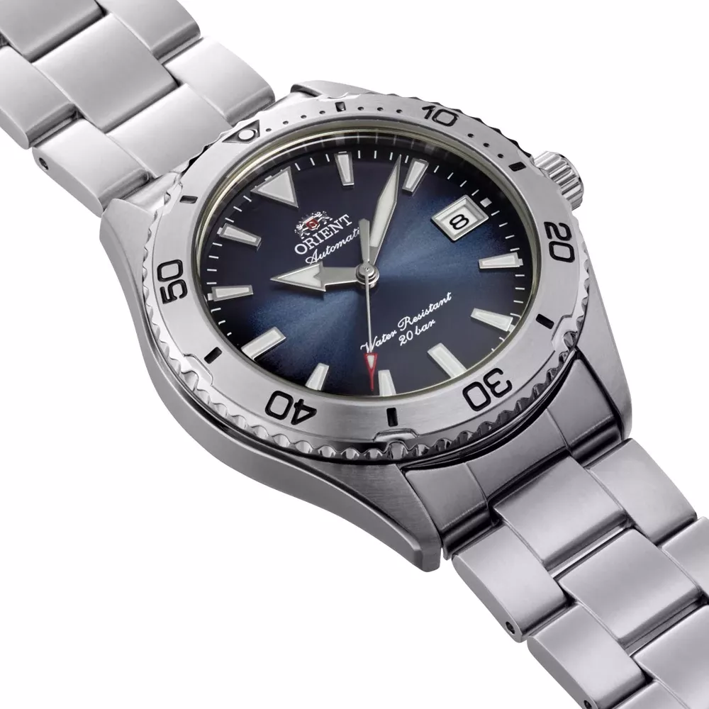 Powered by a reliable Orient movement, the dial is protected by scratch-resistant sapphire crystal. With 20 ATM (200 m) water resistance, the watch is suitable for diving. A date window adds practical functionality for daily use.