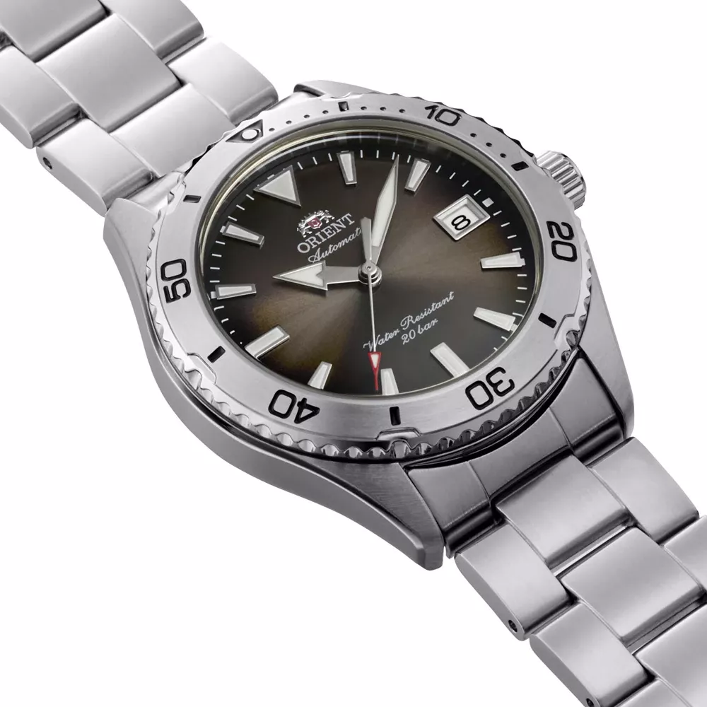 Powered by a reliable Orient movement, the dial is protected by scratch-resistant sapphire crystal. With 20 ATM (200 m) water resistance, the watch is suitable for diving. A date window adds practical functionality for daily use.