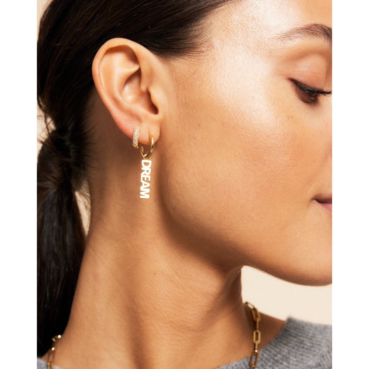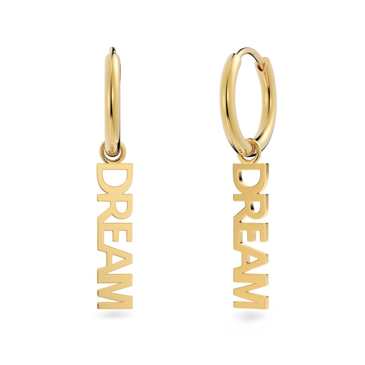 Edblad Dream Hoops -korvakorut yhdistävät modernin muotoilun ja inspiroivan viestin. Pienestä renkaasta roikkuu kultainen laatta, johon on kaiverrettu sana DREAM. Koristeen koko on 20 x 5 millimetriä ja renkaan halkaisija 14 millimetriä. Korut on valmistettu ruostumattomasta teräksestä ja viimeistelty kiiltävällä 14 karaatin kultauksella. Ne ovat nikkeliturvalliset ja vedenpitävät, täydelliset arjen voimakoruksi tai lahjaksi.