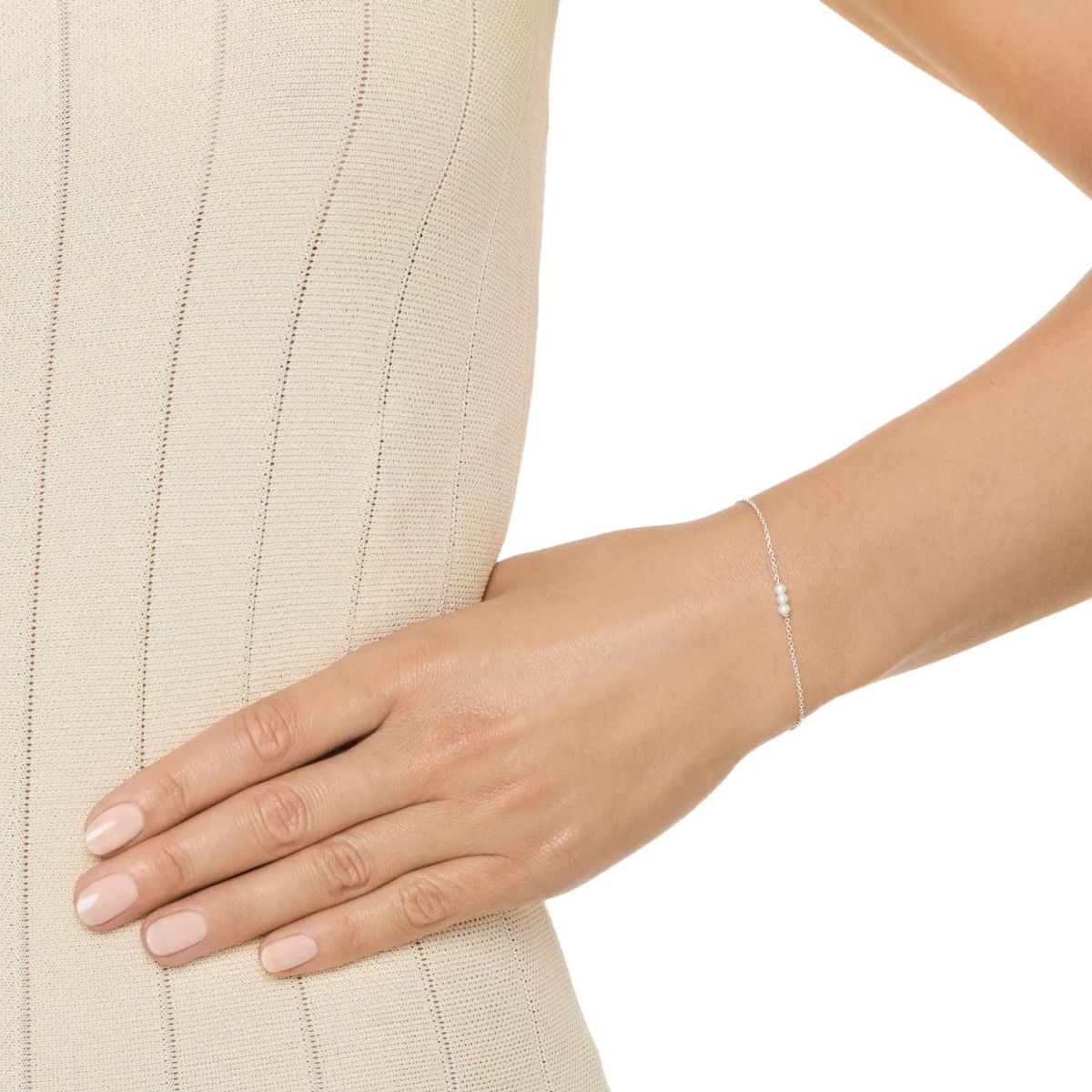 Ohut hopeaketju tekee rannekorusta kevyen ja miellyttävän käyttää, ja sen siro muotoilu sopii täydellisesti minimalistiseen sekä kerrostettuun tyyliin. Helmikoristeet ovat kooltaan 3 mm ja ne asettuvat kauniisti ranteen ympärille, korostaen korun hillittyä eleganssia.