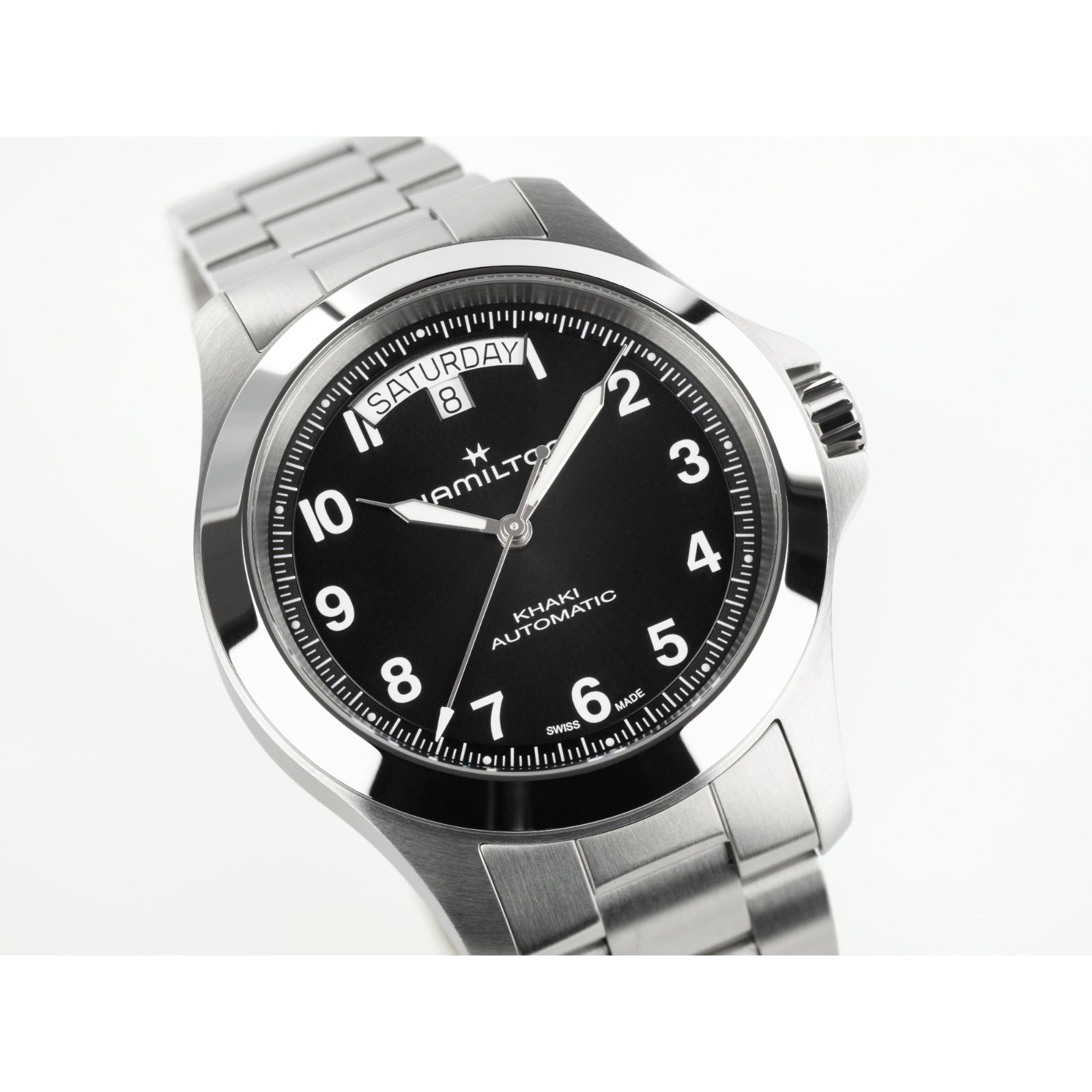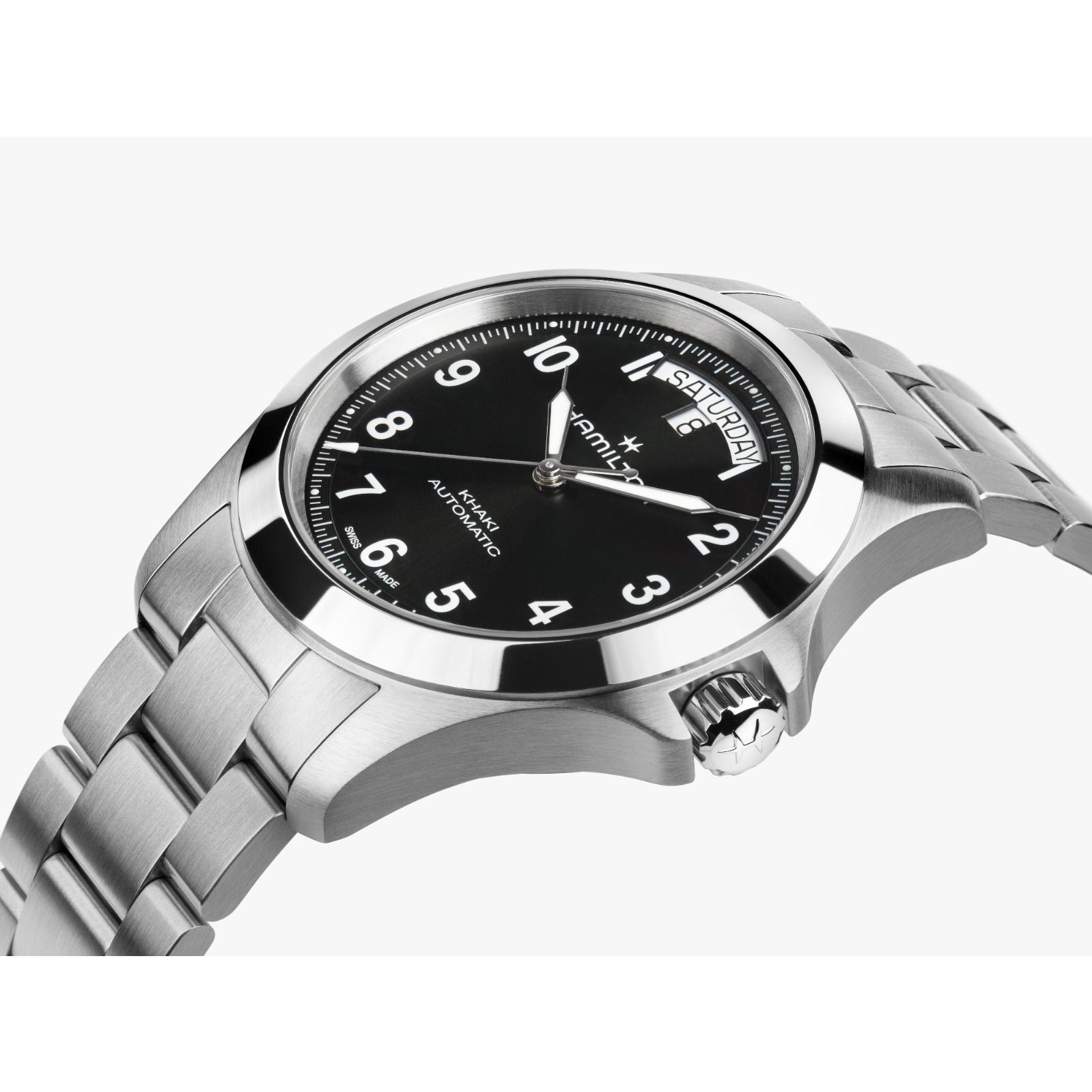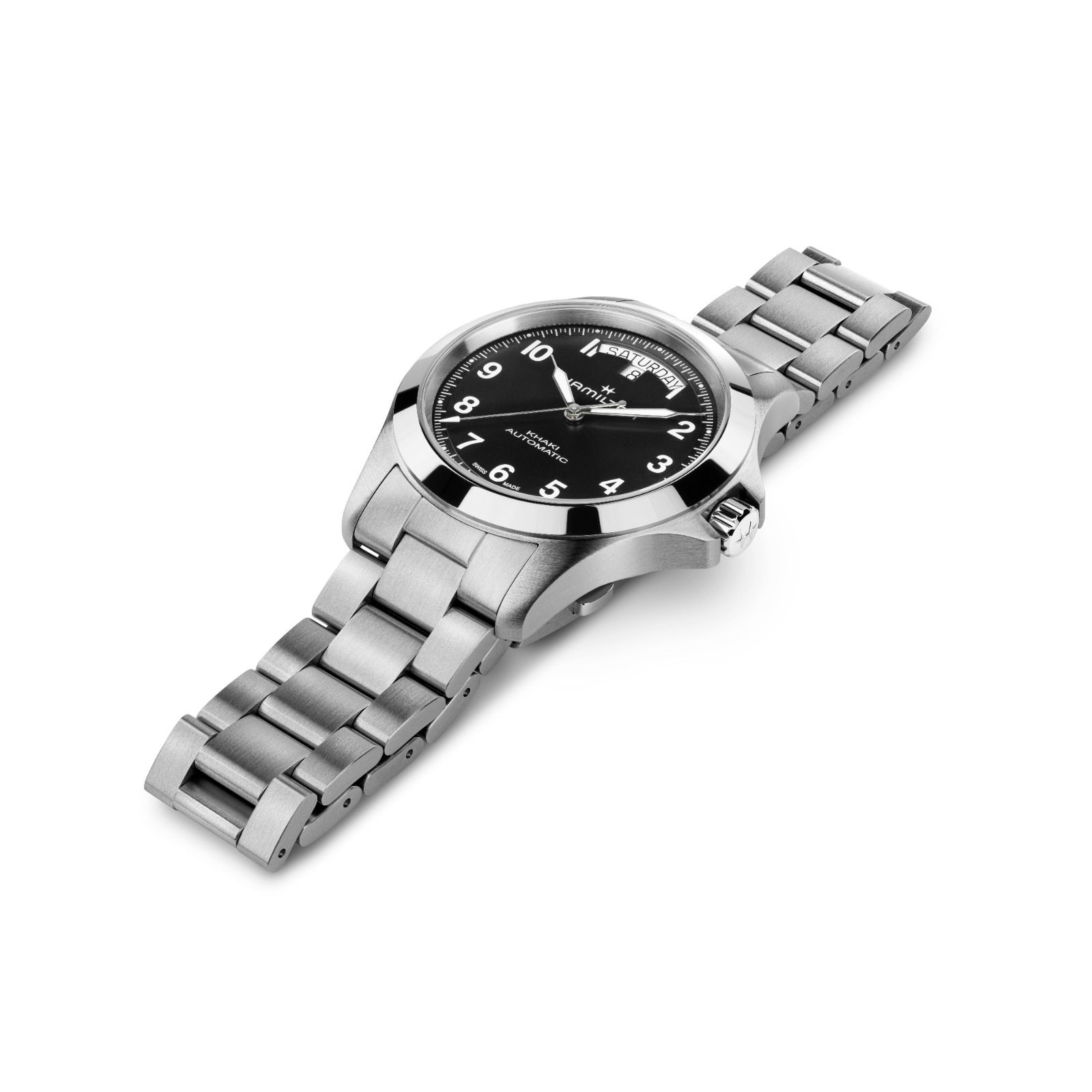 Hamilton Khaki King Automatic Day Date H64475131 on sporttisen tyylikäs automaattikello, jossa käytännöllisyys ja viimeistelty muotoilu yhdistyvät onnistuneesti. Uudistunut Khaki King edustaa malliston uutta suuntaa: ilme on samaan aikaan kestävä, selkeä ja hienostunut. Musta sun-brushed -taulu tuo kelloon ajattoman voimakasta ilmettä, ja teräsranneke viimeistelee kokonaisuuden selkeän tyylikkäästi.
