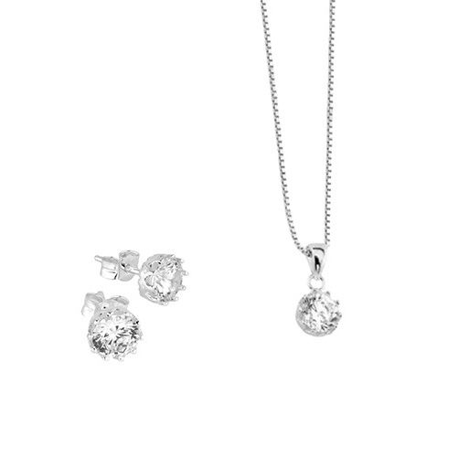 Upea hopeakorusetti kaulakorulla ja korvakoruilla, joita koristaa kirkkaat zirkonit.