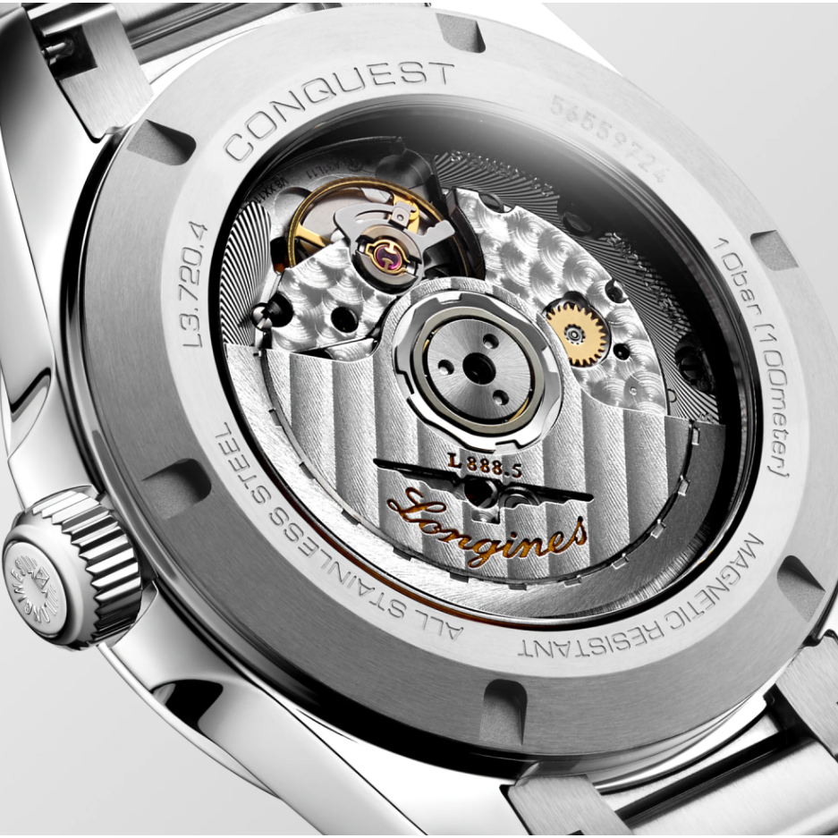 Läpinäkyvä, kierrettävä takakansi safiirilasilla paljastaa kellon sydämen: Longinesin automaattikoneiston kaliiperi L888. Tämä itsevetävä mekaaninen koneisto käy 25 200 värähdystä tunnissa ja tarjoaa jopa 72 tunnin käyntivaran. Yksikiteinen silikoninen tasapainojousi parantaa tarkkuutta ja kestävyyttä sekä suojaa koneistoa magneettisuudelta. Kellon toiminnot sisältävät tunnit, minuutit, sekunnit ja päivämäärän, pitäen kokonaisuuden selkeänä ja käytännöllisenä.