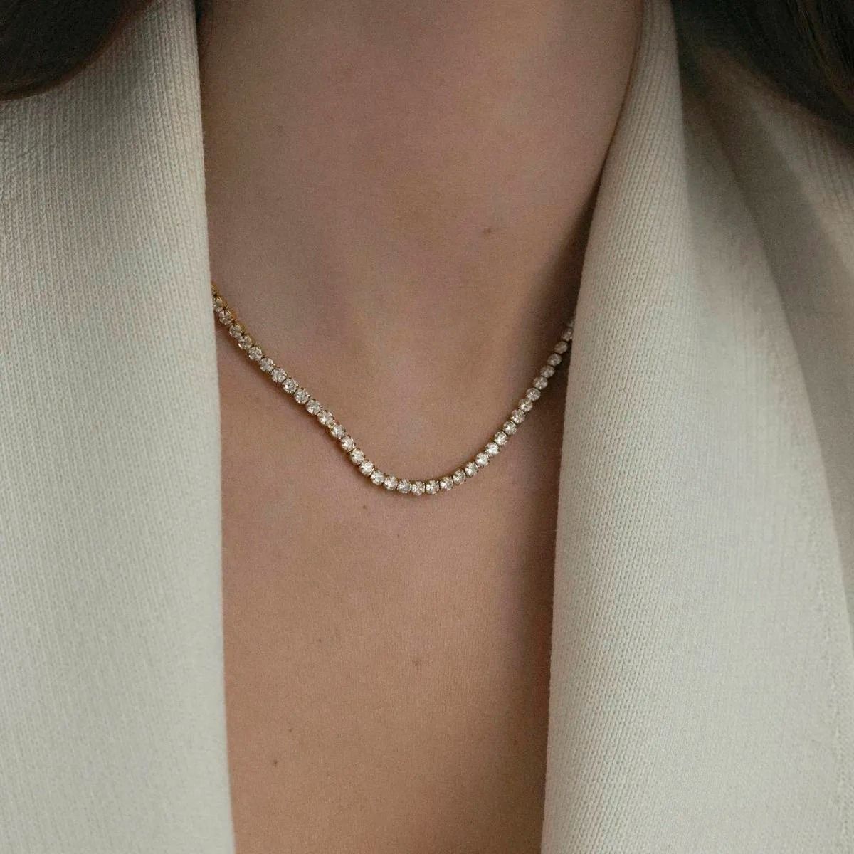 Mockberg Shiny Tennis Necklace Gold on sirompi tulkinta klassisesta tennis-kaulakorusta. Ohuempi, 2 mm leveä ketju on kauttaaltaan koristeltu kimaltavilla cubic zirconia -kivillä, jotka luovat yhtenäisen ja hienostuneen säihkeen koko korun pituudelle.