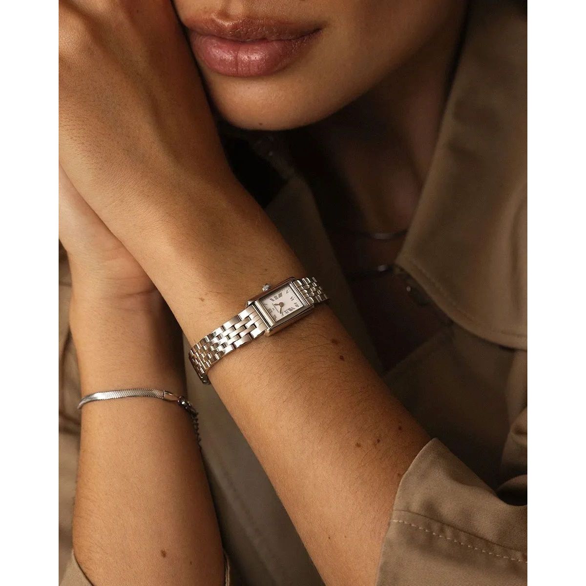 Mockberg Timeless Petite Silver MB1772 on selkeälinjainen ja rauhallisen elegantti kello, jossa pelkistetty muotoilu ja tarkka viimeistely kulkevat käsi kädessä. Pieni koko ja valkoinen kellotaulu roomalaisin numeroin luovat itsevarman mutta hillityn ilmeen, jota viileän hopeinen sävy korostaa kauniisti. Ruostumattomasta teräksestä valmistettu kuori ja linkkiranneke tuovat kestävyyttä ja kevyttä näyttävyyttä arkeen. Japanilainen VC00-kvartsikoneisto takaa tarkan käynnin, ja mineraalilasi kestää kevyitä iskuja sekä naarmuja. 3 ATM -roiskevesisuoja tekee kellosta käytännöllisen päivittäisessä käytössä. Ajaton, huoliteltu valinta jokaiselle päivälle.