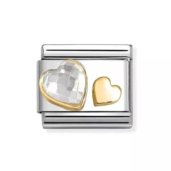 Hopeanvärinen Nomination pala kahdella sydämellä, joista toinen on kullanvärinen ja toista koristaa valkoinen kivi.