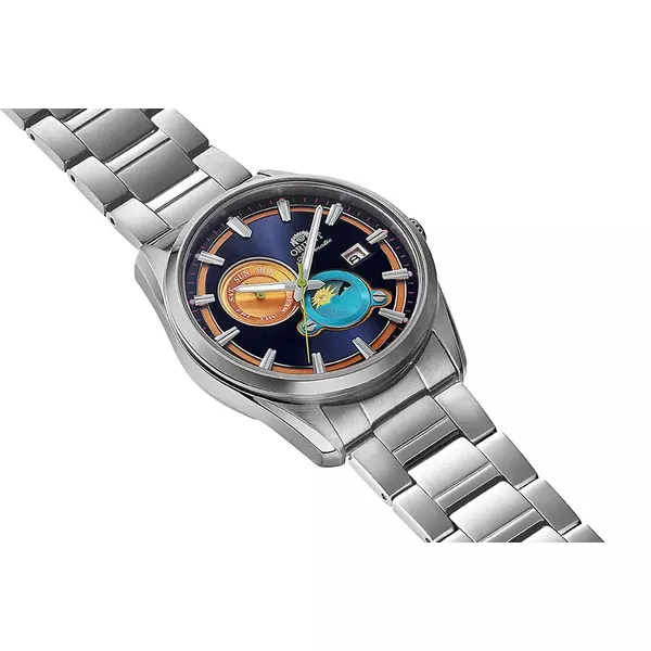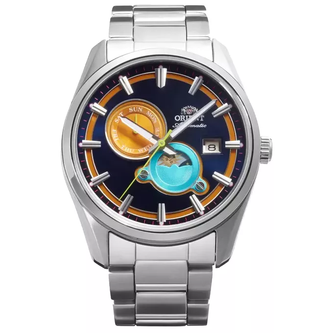 41,5 mm ruostumattomasta teräksestä valmistettu kuori ja teräsranneke viimeistelevät laadukkaan kokonaisuuden. Safiirilasi suojaa sinioranssia kellotaulua, ja 50 metrin vesitiiviys tekee kellosta arkeen sopivan kumppanin.