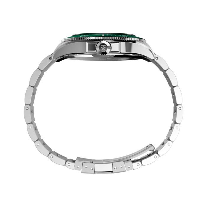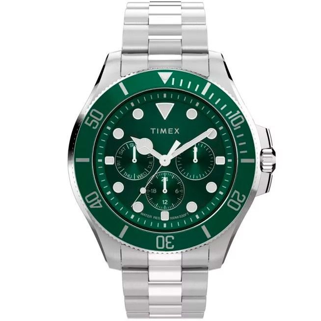 Timex Harborside Coast TW2Y33200 on sporttinen ja monikäyttöinen rannekello, jossa yhdistyvät sukelluskelloista inspiroitu muotoilu ja moderni toiminnallisuus. Kellon vihreä sunray-viimeistelty kellotaulu tuo siihen syvyyttä ja näyttävyyttä, luoden tyylikkään ja ajattoman ilmeen.