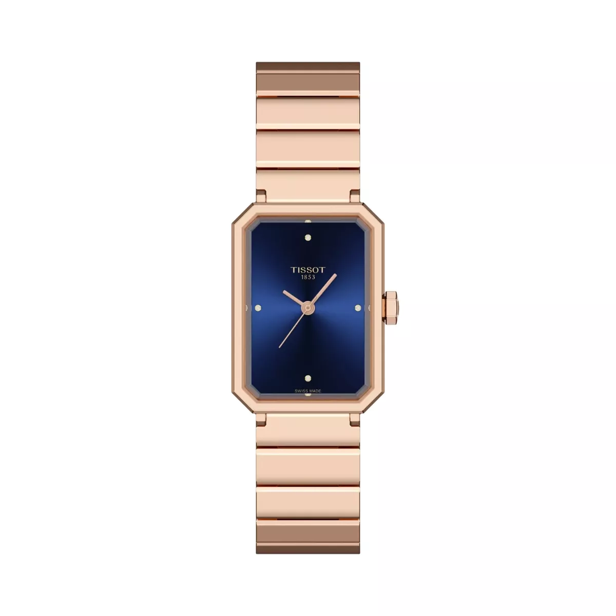 Rannekellon kuori on 316L-ruostumatonta terästä ja siinä on ruusukullalla (carnation gold) päällystetty PVD-pinnoite. Tarjolla on sininen taulu, jossa on neljä timanttia indekseinä – mikä tuo ripauksen hienostunutta loistetta. ETA:n sveitsiläinen kvartsikoneisto takaa luotettavan käynnin, ja akun loppumisen ennakkohälytys (End-of-Life) auttaa varautumaan ajoissa. Safiirilasi on faasattu ja erittäin naarmuuntumiskestävä.