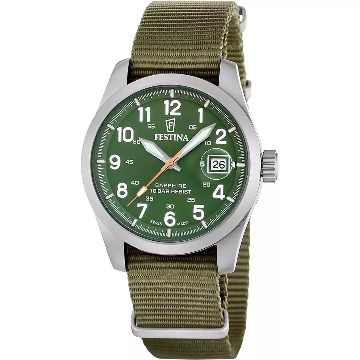 Festina Swiss Made F20082/2 Field fortsätter arvet från klassiska expeditionsklockor i ett kompakt 39 mm format. Den lackerade boetten i 316L rostfritt stål tillsammans med det schweiziska kvartsverket Ronda 715 garanterar pålitlig prestanda och en tidlös design. Det reptåliga safirglaset med antireflexbehandling samt Superluminova® säkerställer utmärkt läsbarhet även i mörker och krävande förhållanden.